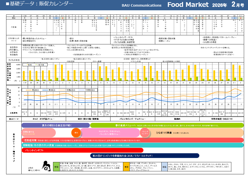 「どの時期に」「どのような食材が」「どの程度」購入されているかを示す表を3枚に分けています。