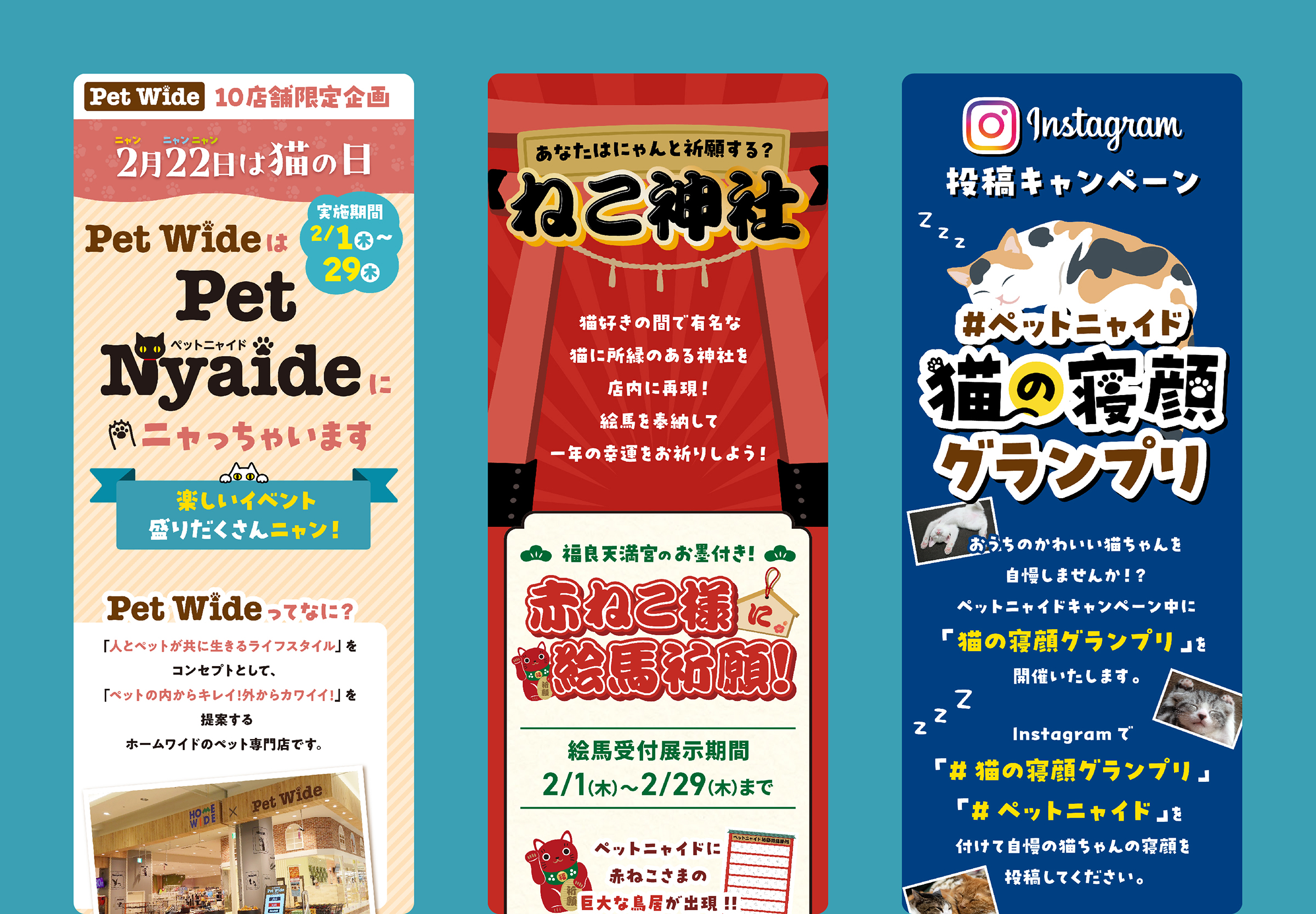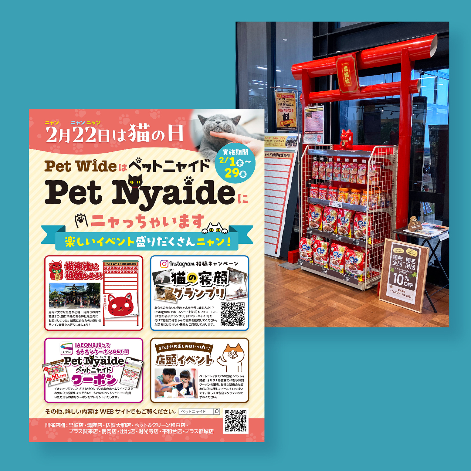 イオン九州ホームワイド様の「猫の日フェア」において、端境期(2月)の活性化とペット部門強化を目的としたプロモーションを実施。企画提案からライティングページ制作、店内演出、SNSキャンペーン運営まで一貫して担当し、売場とデジタル領域を連動させた集客を実現しました。